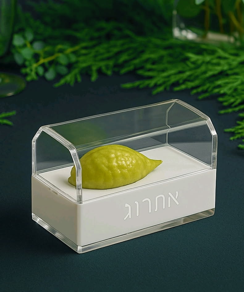 A beautiful esrog carefully packaged in a ZStander Lucite Esrog Box!